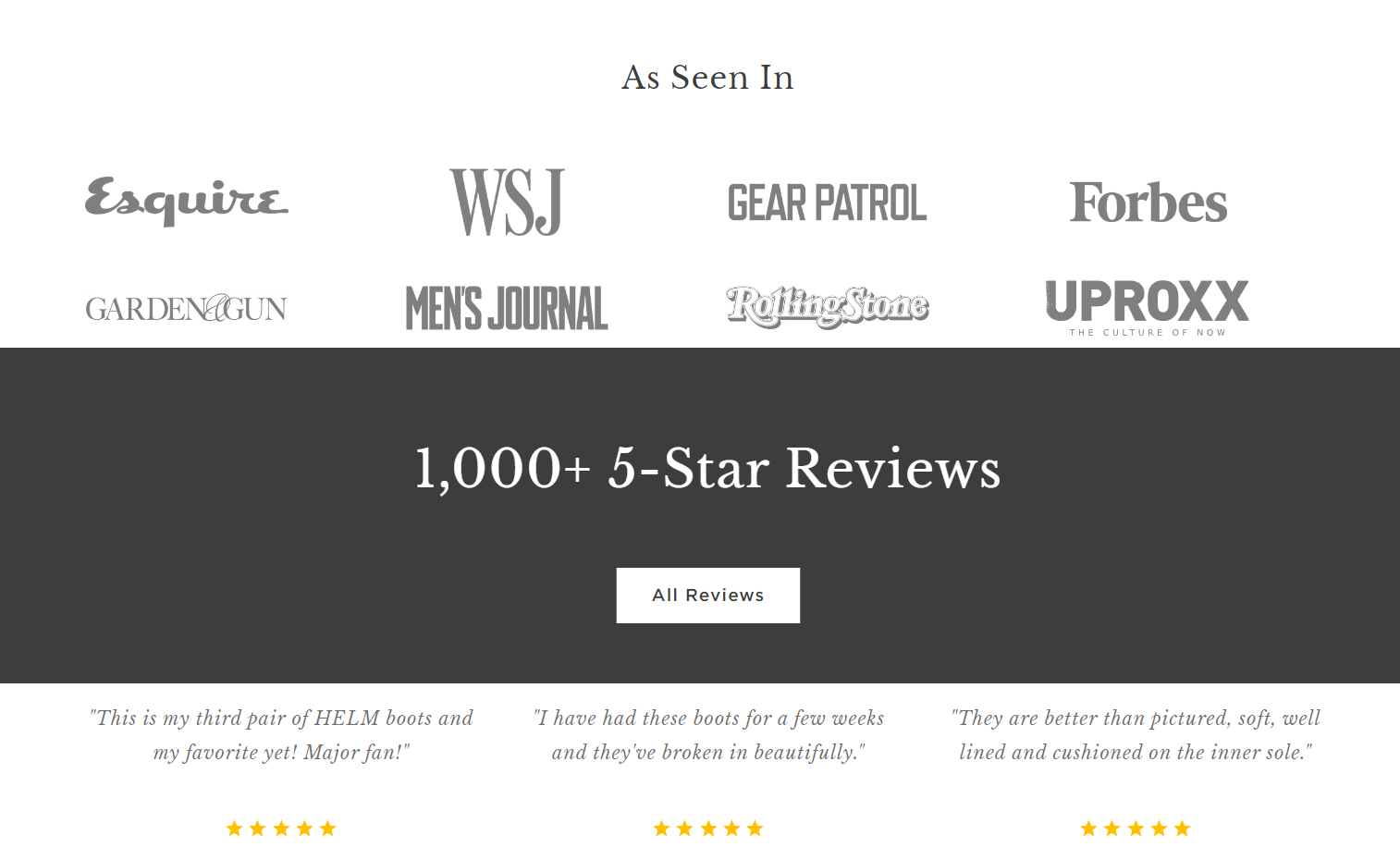 • Exhibit credibility: Spotlight why clients ought to belief your retailer on your private home web page and product pages. Showcase the place your merchandise have been featured or what number of nice evaluations they’ve earned, like HelmBoots.com does right here: