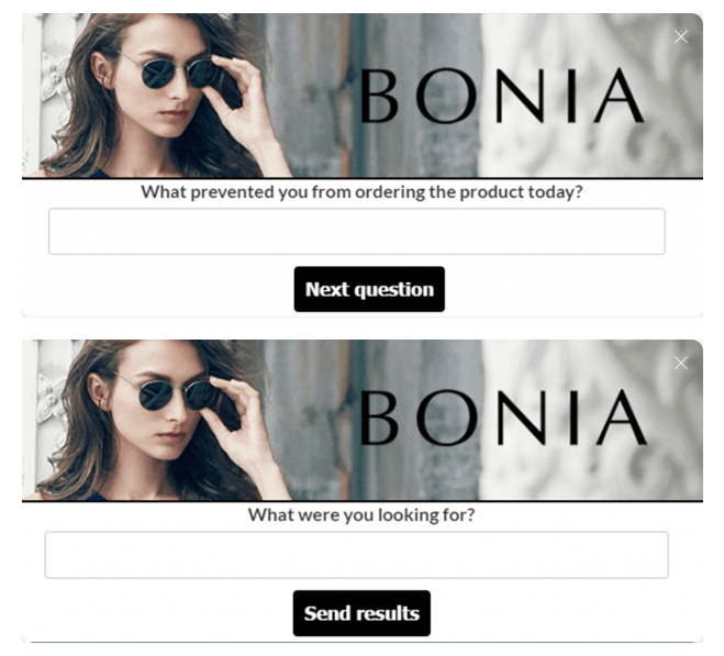 After getting your quantitative information, construct on it with qualitative insights. You may ask clients questions utilizing automated surveys and pop-ups, as Bonia does right here, to seek out out why they may not have made a purchase order or what merchandise they had been searching for: