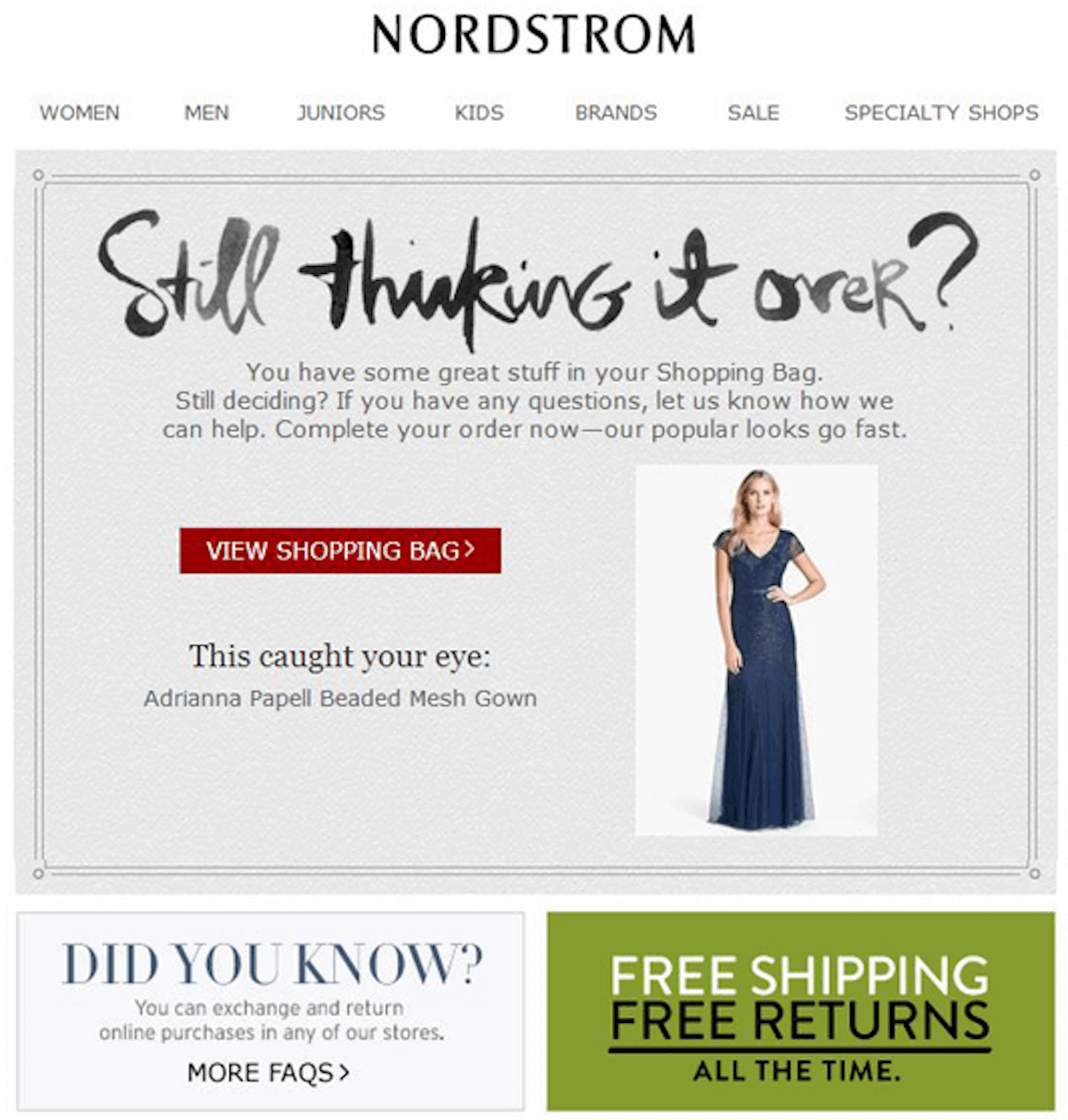 Right here’s an awesome instance of an deserted cart e mail from Nordstrom, which highlights the product the shopper checked out, the positioning’s FAQ web page, and their free transport and free returns provide: