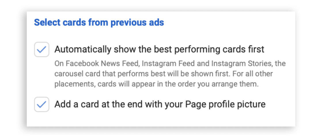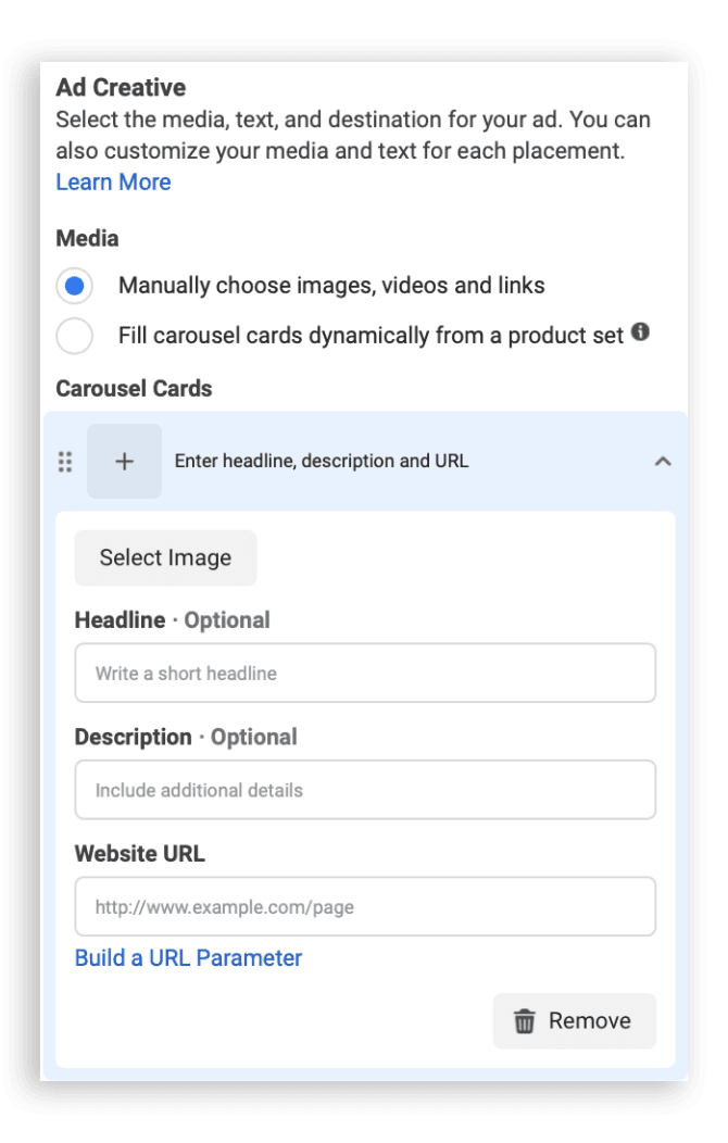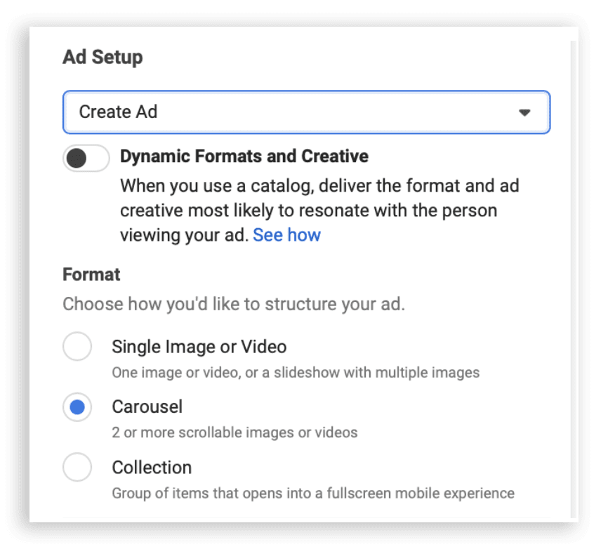 If you select the carousel format, you possibly can resolve if you wish to enter pictures out of your product catalog or select them manually.