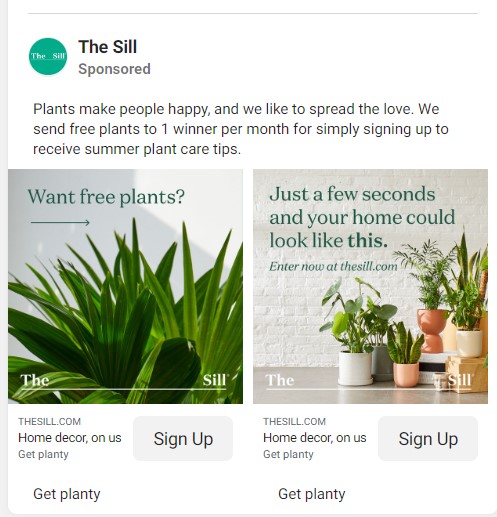 Probably the greatest methods to make use of Fb carousel advertisements is to inform a charming story. The Sill, an organization dedicated to convey pure magnificence into the house, is superb at utilizing this technique. The corporate commonly promotes carousels telling clients how you can accomplish varied aesthetics at house.