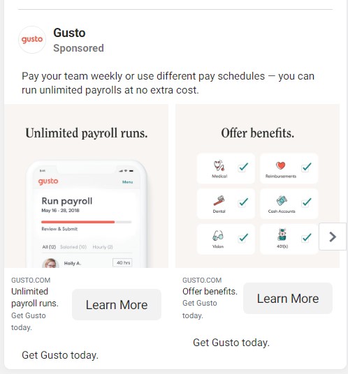 On this Carousel Advert from Gusto, the corporate makes use of a quick introductory caption to focus on one among its predominant promoting factors. Within the carousel panels under, every picture highlights a selected worth enterprise leaders can get from signing up with Gusto—from limitless payroll runs to customized advantages.