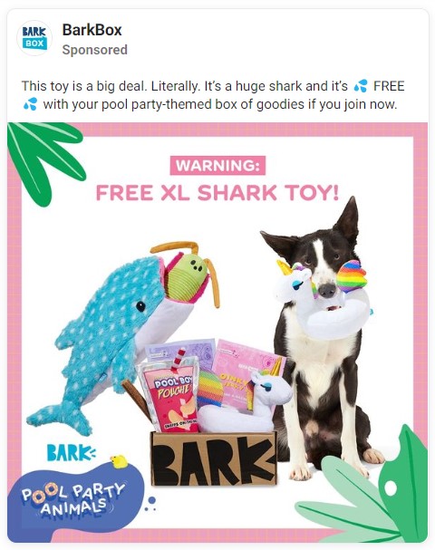Canine toy and deal with subscription firm Barkbox are consultants at leveraging all of the distinctive promotional alternatives Fb has to supply. The corporate combines its playful tone of voice in its Fb advert captions with enjoyable and crowd pleasing pictures in its carousels. This instantly grabs the viewers’s consideration, whereas giving an perception into the corporate’s values.