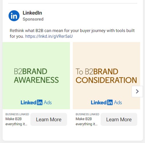 In LinkedIn’s carousel advertisements, the corporate asks customers questions on their enterprise processes. This Carousel advert introduces the advantages of LinkedIn advertisements with a sequence of panels “redefining” what the B2B journey can imply to purchasers.