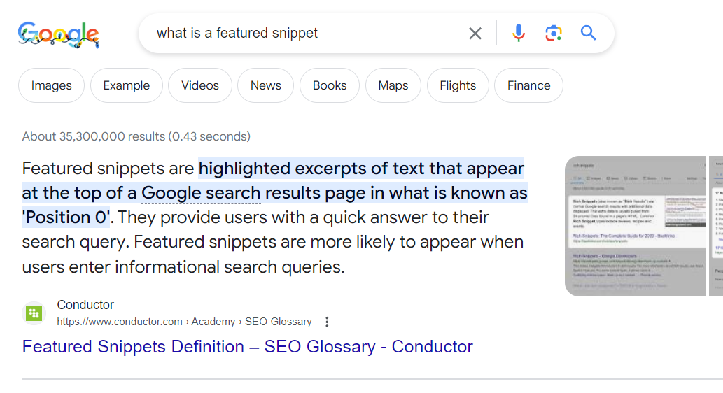 The featured snippet is the quick abstract reply that seems on the high of a Google search above the “Individuals additionally ask” part: