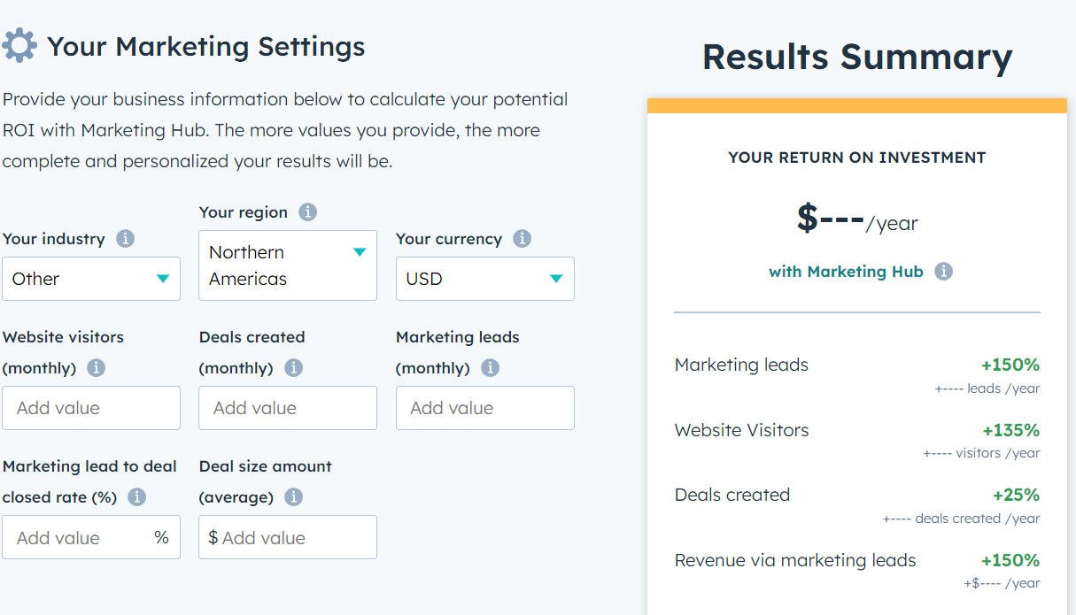 - Free instruments: Free instruments like calculators or checklists are incredible for producing backlinks and shares. As an illustration, HubSpot has a calculator on its web site that may assist customers calculate their return on funding from sure advertising and marketing instruments. Not solely is that this a helpful useful resource, however it permits HubSpot to gather lead contact particulars by asking for an e-mail deal with.