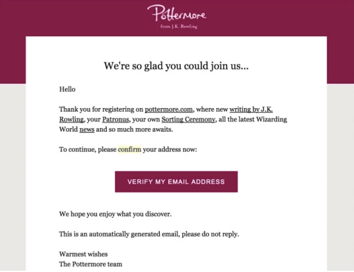 J.Ok. Rowling’s Pottermore double opt-in e-mail instance displays their model’s voice (you possibly can think about J.Ok. Rowling chatting with you right here!), well mannered and pleasant, brief and candy, with the CTA button highlighted, asking the brand new subscriber to confirm their subscription. It additionally begins with a short description of the advantages the brand new subscriber will probably be receiving after they’ve confirmed, incentivizing their immediate affirmation.