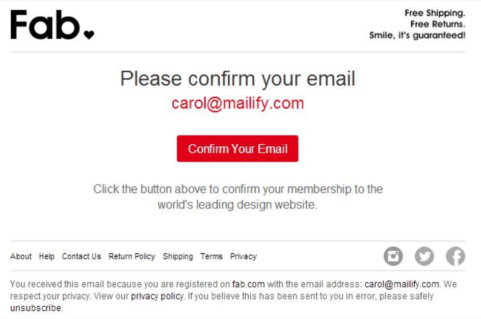 Research Fab’s double opt-in e-mail instance beneath which isn’t solely brief and candy, but in addition emphasizes Fab’s core advantages within the e-mail design, shortly and sweetly, too: