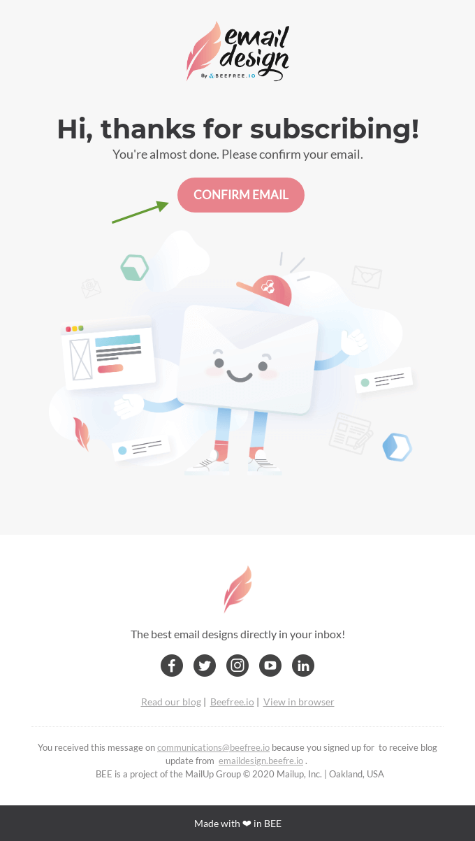 E-mail Design’s double opt-in e-mail instance is even shorter and sweeter, with extra visuals than textual content, and a lightweight, nice really feel to it. The decision-to-action (CTA) button is highlighted with a extra stable shade in opposition to an virtually white background, plus a inexperienced arrow pointing to the CTA for emphasis.