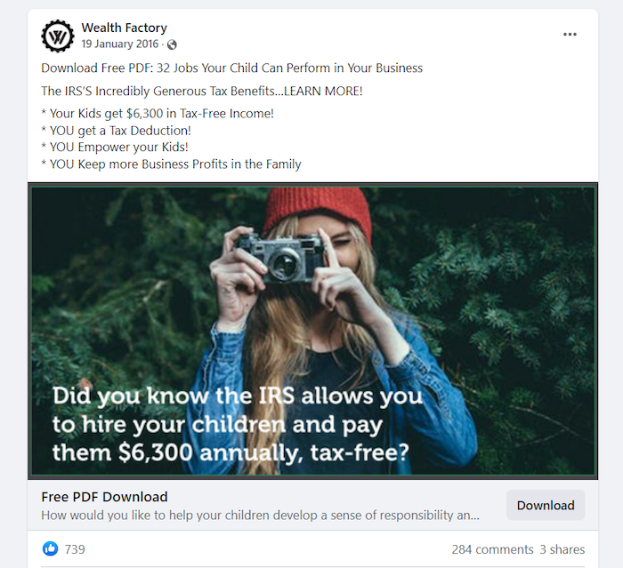 The Wealth Issue used a Fb Lead ad with a free PDF as a lead magnet to generate extra consideration from their audience. Promising clients a free PDF with entry to priceless data focused at particular shoppers leads to an enormous ROI.