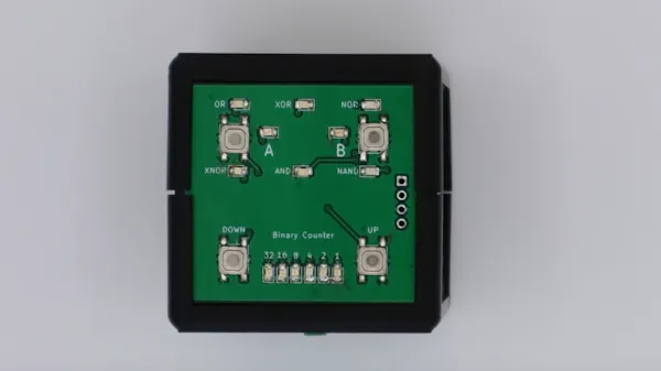 The third facet was most likely probably the most concerned, because it not solely incorporates an similar AVR64DA32 microcontroller as used within the earlier face, but additionally has a collection of six LEDs that act as a show for a binary counter and a number of other different LEDs that present outputs for varied logic gates. For instance, not urgent both button on the PCB will trigger XNOR, NAND, and NOR to all gentle up.