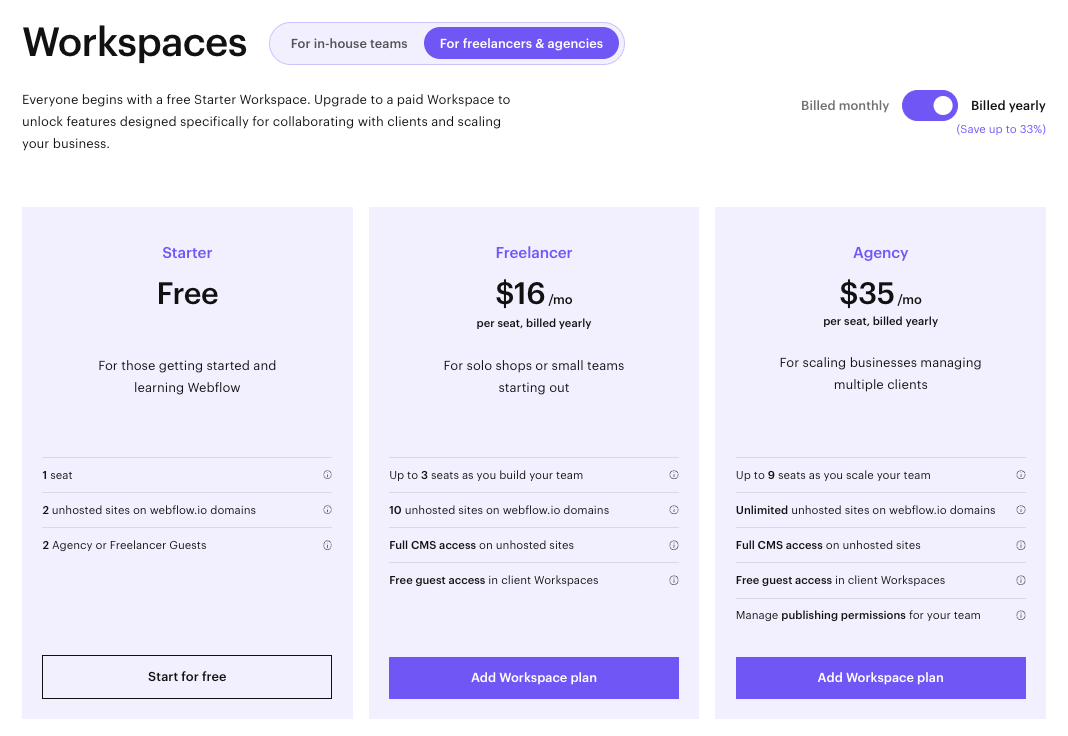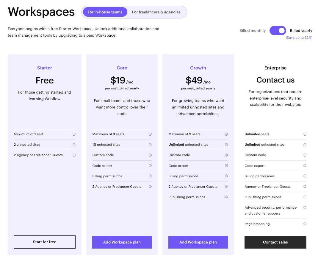 Webflow’s free Starter Plans are free perpetually. Nonetheless, your web site constructing and internet hosting wants develop over time if your enterprise scales.