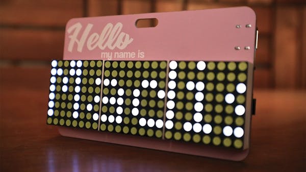That “one thing a bit additional”: A wearable badge, impressed by iconic hand-written adhesive “Whats up, My Title Is,” which drives two or three LED matrices with scrolling textual content.