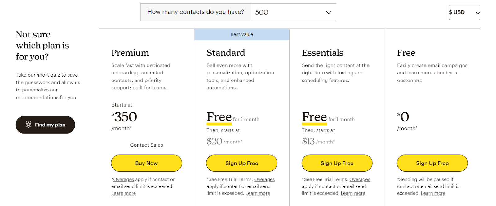 MailChimp affords a free plan to novices, which lets you ship as much as 1,000 emails a month and helps each a single consumer and a single viewers. You additionally get kinds and touchdown pages, however the remainder of your options will probably be extraordinarily restricted. There are just a few Mailchimp Alternate options that provide rather more spectacular free plans, reminiscent of: