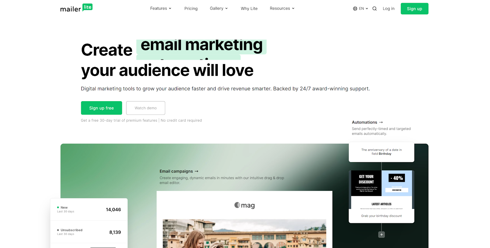 MailerLite is a software we’ve used quite a few occasions previously for each transactional emails and newsletters. It’s simple, user-friendly, and intuitive, with a smooth and clear dashboard anybody can study to make use of. Like MailChimp, MailerLite has additionally just lately begun including AI to its service, providing you with an assistant that may generate emails, topic strains, and extra with just a few prompts.