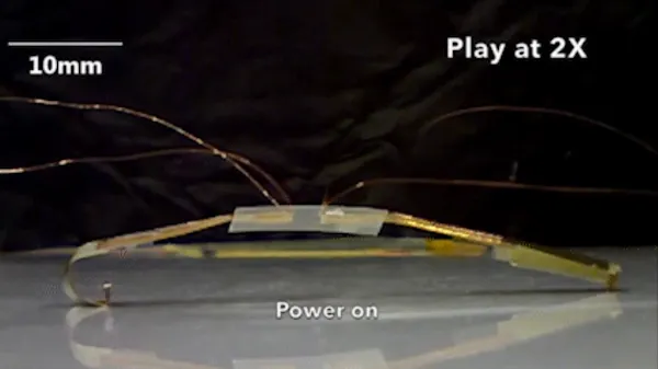 Sometimes, actuation in synthetic muscle tissues is a sluggish course of, one the engineers needed to hurry up. The reply was discovered within the interaction of molecular order and geometry. The curved composite form of the bogus muscle permits it to construct vitality when launched to some volts of present. When that present is eliminated, the vitality is discharged, and the robotic springs ahead. That versatile motion and light-weight weight allow the robots to maneuver throughout sand as rapidly as a flat floor and even hop throughout water.